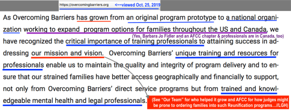 “Overcoming Barriers: Rethinking Parent-Child Contact” (<~that name reflects web motto; 501©3 name is just “Overcoming Barriers, Inc.”, Massachusetts: WOW, look at the (lengthening since last I looked) assemblage of “Our Team” incl. two from Sandhill Global Advisors, several who admit to AFCC membership, Barbara Jo Fidler, and Leslie Drozd claims to be (probably is) founder of “Journal of Child Custody 2004-2013, as well as on board of “FCR” (code for AFCC’s main journal/mouthpiece, “Family Court Review”; at least two mention involvement with Kids’ Turn (parent education, parental alienation “innocculation” classes), which I’ve blogged as having submerged itself (merged out) into SF Child Abuse Prevention Center (now “Safe & Sound”)… (see links from FrontPage)