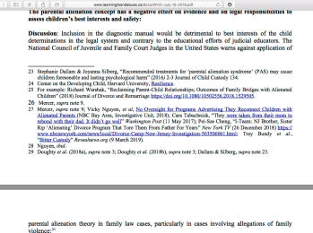 - Page 1 of pdf uploaded to CREVAWC (London, Ontario, Canada) Lead-in text (NCJFCJ cited), FNs 23-29 to “Collective Memo of Concern about “Parental Alienation” to WHO (July 10, 2019).” Footnote 27 references ‘Mercer, supra note 9’ and a string of media articles from 2018 and 2019, most re: reunification camps and programming (Vicky Nguyen et al., Trey Bundy et al., Cara Tabachnick, and Pei-Sze Cheng (Also NBC) (Clean copy. See nearby heavily annotated one! //LGH 2019Aug23