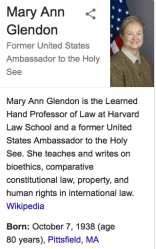 Mary Ann Glendon was born in 1938, is a University of Chicago Law Grad, and was former Ambassador to the Holy See. It was just announced this past JULY (in Catholic News Agency) that the (Trump Administration) U.S. Secretary of State Mike Pompeo has appointed her to head a Human Rights Commission. This is a new commission (see first few paragraphs):