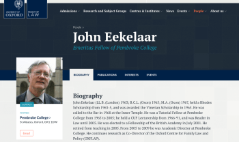 John Eekelaar biography (incl. degrees and work history: NB Rhodes Scholar (NS here, born S. Africa), Publications List