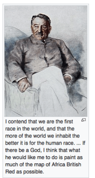 Cecil Rhodes attempted/wanted span the continent of Africa South to North, to “Paint it Red” for Great Britain; had no question that the Anglo race was the world’s greatest and that the more there were, the better it was for the world, and that colonization was essential to prevent civil war at home…