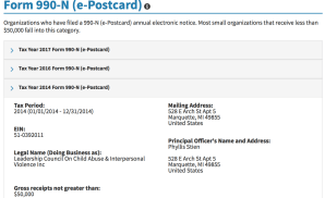 Leadership Council for Child Abuse & Interpersonal Violence, Inc., in Marquette, Michigan, EIN#510392011, IRS shows it filed Form 990-N only for the above years. (Imaged Nov. 25, 2019: Where is FY2018 return?)