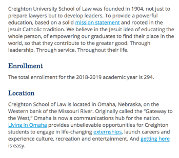- Creighton Univ School of Law | Jesuit Educ, sicne 1904, 294 students now. They have a new Dean with JD from Tulane Univ. Omaha as Communications Hub and “Gateway to the West” (on the Missouri River)