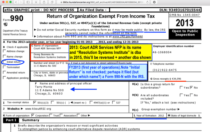 RSI (AboutRSI.org) (EIN#461068004) FY2013 (YEDec) Form 990 shows RSI is the dba + ‘Court ADR Services NVP the name ~~Screen Shot 2019-11-23