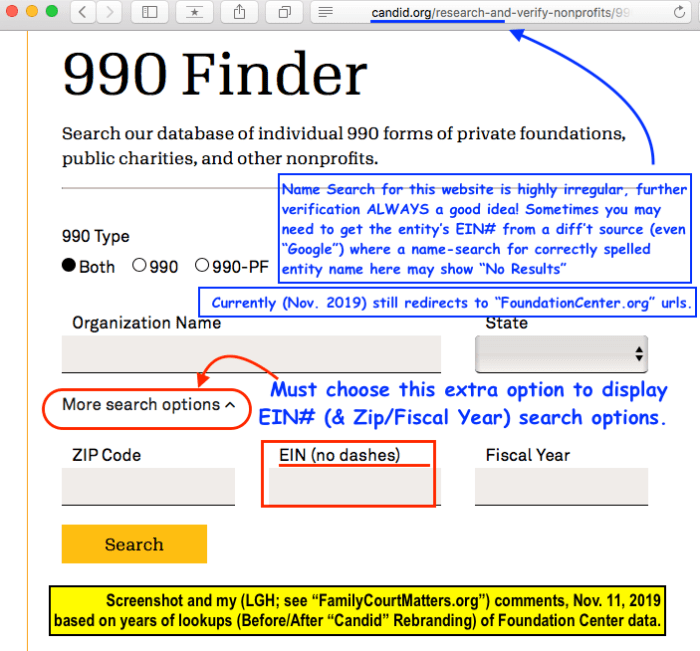 Oh, Arizona: Mind Your Behavior! (The Career AFCC Academics’ Dilemma: “To Admit, or Not to Admit?”) Nov. 25, 2019 » Candid.org 990-finder (Annotated) showing EIN# Drop-down option | SShot 2019-11-11 Mon PST @9.28.57 AM