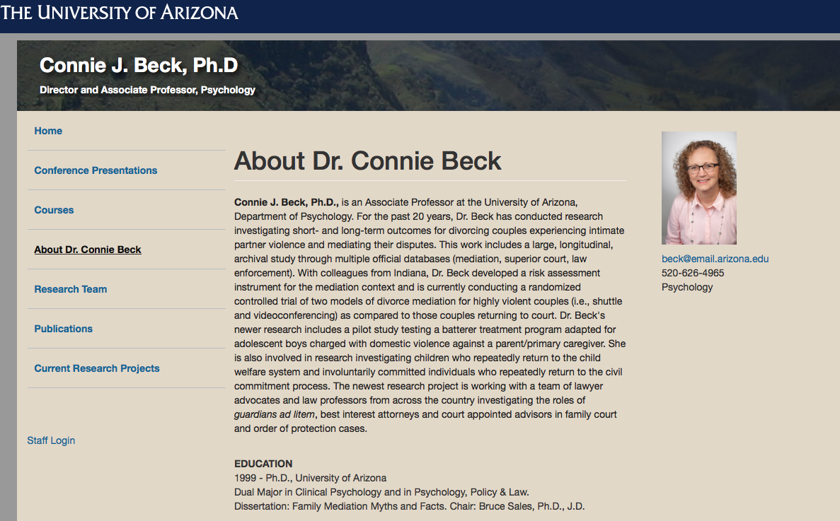 Oh, Arizona: Mind Your Behavior! (The Career AFCC Academics’ Dilemma: “To Admit, or Not to Admit?”) Nov. 25, 2019 » Connie Beck PhD (Psych) (Beck,CJA) UnivAZ Tucson ~~ Faculty Pg & CV~> AFCC NOT undercover (See Also Bruce D Sales PhD,JD (1960s,1973) mentor ~~19 Screen Shot 2019-11-08 at 4.03.38 PM 1