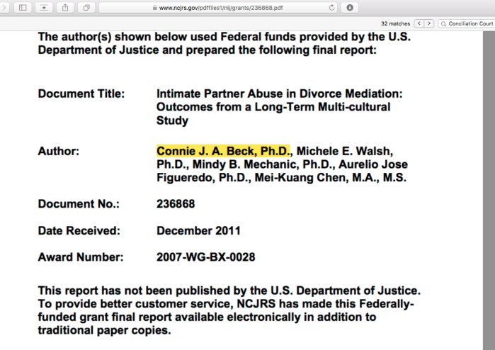 ‘IntimatePartnerAbuse in DivMed’tn|Outcomes frm a Long-Term Multi-cultural Study’ (NCJRS.gov doct’ 236868 Dec 2011) USDOJ-NIJ Grant 2007WG-BX-0028 Beck,ConnieJA+4 (SrchResults ‘Dingwall’)~~ SShot 2019Nov08 FRI PST @3.55.33 PM