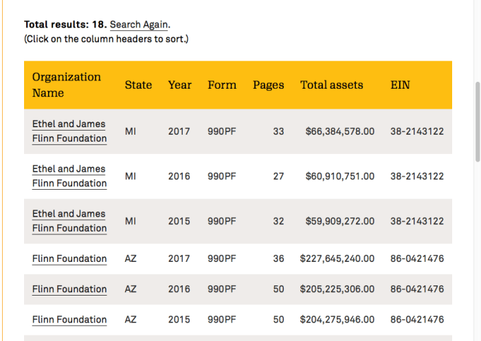 Candid.org’s “Flinn Foundation” Namesearch results, Image only shows the first 6, (= 2 largest total assets orgs, 3 yrs’ worth each = six rows), out of 18 total). TINYURL Link to FY2017 for the ‘Flinn Foundation’ in AZ: tinyurl.com/FLINN-AZ990PF2017-ein860421476. See LGH post Nov 11, 2019, ending “-bzx”