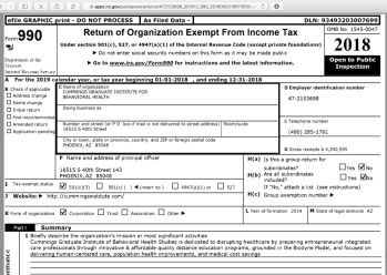 While displaying about $40M assets (and a similar amount liabilities), how those assets are characterized, and that its about $1.14M of “contributions” came mostly from two contributors — one another nonprofit in Ohio ($1.13M) and $10K even from an ‘NDC Enterprises’ co-located with the CFBH is odd, an “anomaly” and presents is another major investigative task to first, untangle and second, narrate in coherent terms, which the tax returns, taken together, do NOT provide if taken at face value and individually rather than as a whole. This then has to be put to the Secretary of State level filings in (at least) two states: Nevada and Arizona.