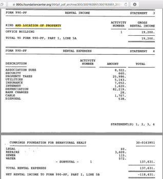 The website mentioned “Cummings Foundation for Behavioral Health” and the Cummings Foundation, so I went for both of them. Website did NOT mention that the former is being funded by another organization (“American Endowment Foundation“) in Ohio and has invested in some real estate in Nevada, and that its (CBFH’s) major “asset” category by far (making it look so big) is “Pledges and grants receivable.”)