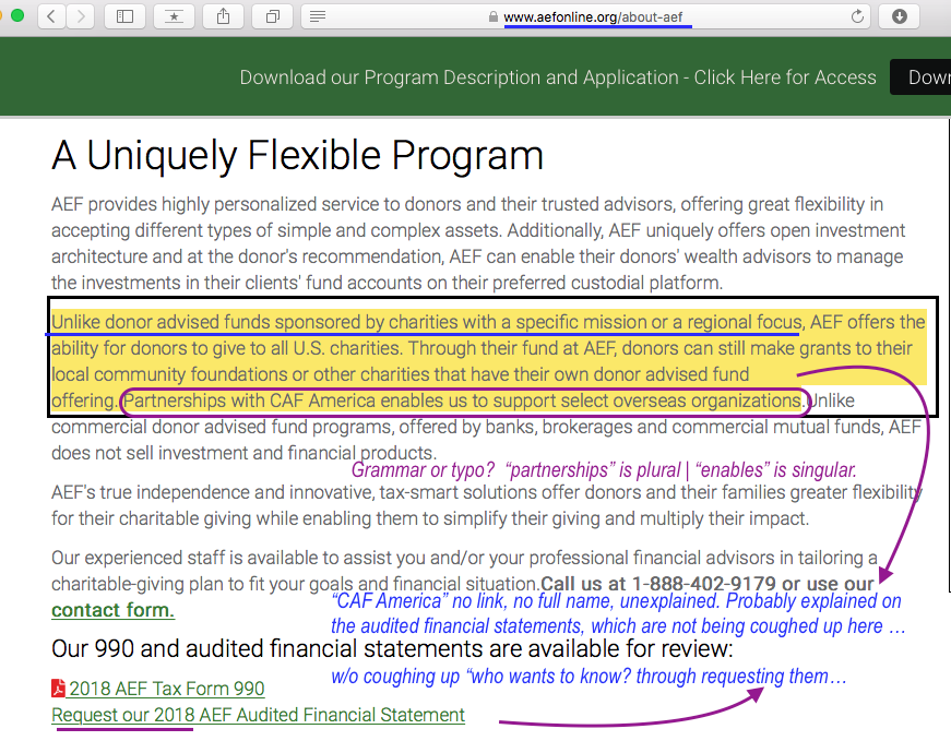 Three Tax-exempt Cummings Entities (Inc. 1994 and 2004 (co-located) in Reno, NV, and 2014 in Phoenix, AZ) and Their Family-Controlled Personal Agenda: Taking Former Arizona State U’s ‘DBH’ Accreditation International, Con’td. (#2 in a Pipeline, Publ. Dec. 16, 2019). » AEFonline.org – ‘DAFs unlimited’ purpose (and showing one 990 (2018) only, audited FS only on request) Screen Shot 2019-12-05 at 1.05.30 PM