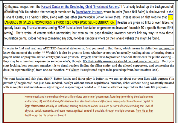 It’s about (justifying) universal control of the future workforce from birth forward, justified by “Brain Science.” Apparently part of this entails ensuring (by practice and example) a work force incompetent to even look for its leaders ‘financials and kept bewildered (or harassed simply having to plow through propaganda looking for some solid information or admitted links to it, on website after website).