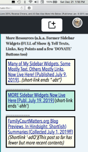 **Full widget title (See nearby image): “More Resources (a.k.a. Former Sidebar Widgets (FULL of Show & Tell Texts, Links, Key Posts and a few “DONATE” Buttons too).”