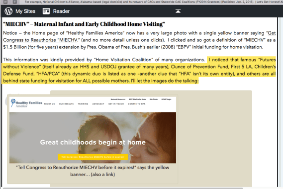 which references (my post text named a few) who’s pushing for Home Visitation ad infinitum… and the “Home Visitation Coalition,” large image referencing “MIECHV, that is, “Maternal, Infant and Early Childhood Home Visiting”…