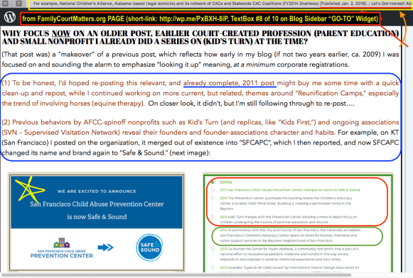 While here, I’m also re-publicizing that Page (accessible/shown in “Text Box 8”) as it supplements two related posts (shown in “Text Boxes 9 and 10” of 10) which represents a major drill-down, I also talk up current principles still important as applied to specific named organizations still impacting the “Child Abuse Prevention” and ‘Child Advocacy” fields (and influencing dyanmics of the family court systems) something of deep concern to, I believe, most people.
