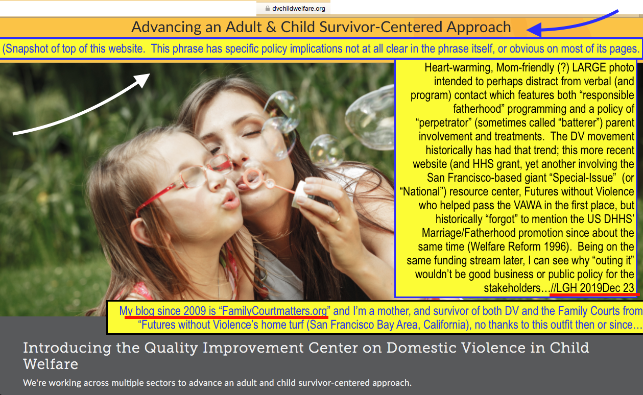 ‘Family Court Matters’ Issues Summary, At This Time: Right Sidebar ‘GO-TO | Current Posts’ Widget (Publ. Dec. 21, 2019 as 13th Sticky Post). » DVCHILDWELFARE.org (a ‘QIC’ on the two fields) HHS|ACF|Grant 90CA1850-01 funds website, Futures w|o Violence] Viewed 2019Dec23 Mon PST @ 2.15.55 PM