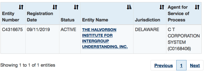 Calif S.O.S. Registration shows “The Halvorson Institute for Intergroup Understanding, Inc.” only registered (with them) in 2019 as a Delaware Entity. Note: the “C” Entity# is a searchable piece of data usable at California OAG RCT (Registry of Charitable Trusts) which in some cases (i.e., if found there) will lead to the associated EIN#.