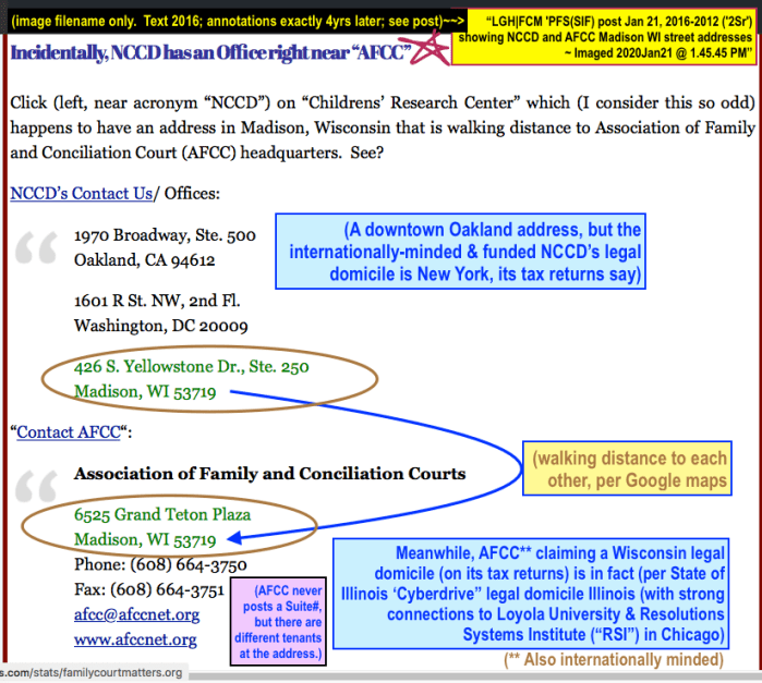Pay For Success Social Impact Funding (SIF) = Same Old Public/Private Pipelines, Faster Flow: Why Do We Submit? [Too bad was NOT published Jan 21, 2016, but is Now: Jan. 21, 2020]. » LGH|FCM ‘PFS(SIF) post Jan 21, 2016-2012 (‘2Sr’) showing NCCD and AFCC Madison WI street addresses ~ Imaged 2020Jan21 @ 1.45.45 PM