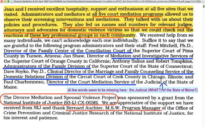 ‘Divorce Mediation [and] Domestic Violence’ (per a 1997 NIJ-funded report by Jessica Pearson, Ph.D. of CPR, (and now, FRPN.org) raises the question: Do the DV Industry USA Orgs. know about AFCC? (Yes!) Since When (I DNK: 1980s?). Are They Acknowledging AFCC? (Generally, No!). So? (Know Your Organizations!) [A Nov. 19, 2019, off-ramp from ‘Oh Arizona!’ Post, Publ. Jan. 25, 2020]. » ‘DivorceMediation&DV,’ April1997 Doct164658, by CenterPolicyRsrch(JessicaPearson) ‘in collab w|AFCC’, NIJ Grant#93-IJ-CX-0036 (found only 2019Nov11)~7 imgs, pdf is 235pp!~ 2020Feb1 Sat PST @5.35.05 PM