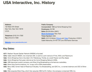 FundingUniverse.com on “USA Interactive, Inc.” (but only until 2002) re: Barry Diller, Silver Communications, Inc. (orig. a subsidiary of HSN) — did USA Interactive, Inc. become “IAC” sometimes after 2002? DNK yet — either way, it’s a window into how the industry operates, and consolidations, dealmaking, sell-offs for the industry…