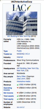 In case there’s any question that IAC is the former USA Interactive, Inc. referenced above on FundingUniverse.com, Wikipedia on IAC clears this up. See nearby two images. I also note (not shown here, but on the Wiki) that among the directors is one actual Prince (son of Diane von Furstenberg, the famous (and iconic, and it seems fearless) fashion designer, who married a prince, briefly); Barry Diller (married DVF in 2001, per her Wiki) is his stepfather; there is a Diller-von-Furstenberg Family Foundation.