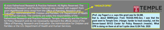 Temple University Professor Jay Fagan (who’s been at Temple, after his 1988 Columbia Univ. PhD, nonstop since about 1990)… He has articles published in a magazine (‘Fathering”) he co-founded, and a key association on the c.v. (also listed at FRPN.org under “Other Organizations”) seems to be the ‘National Council on Family Relations’ (19 references in 15pp c.v.: [Click twice to read the pdf: Jay Fagan,Prof~BA Psych (TrinityCollege, CT 1973), MSW (UPA, SchlSocialWk SW,1977), PhD (in__??)Columbia SSW 1988) |Temple Univ Philadelphia (+ FRPN.org), 15-pg CV Oct 2019 (see 19occ ‘NCFR,’ ref to the HHS grant (for FRPN) + only 2books (@ 2020Feb13)] The c.v. says “School of Social Administration” not “School of Social Work.”