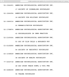 The ABA and APA as nonprofit associations with related entities are also fine opportunities to practice the “990s” and “corporate-filing” (state-level) skills we need in order to cut through some propaganda and start translating legalese and the even more specialized jargon (sic) of the psych-fields (here, “psychology”) into a practical overview in economic [accounting] and business terms that any other nonprofit might have to show: