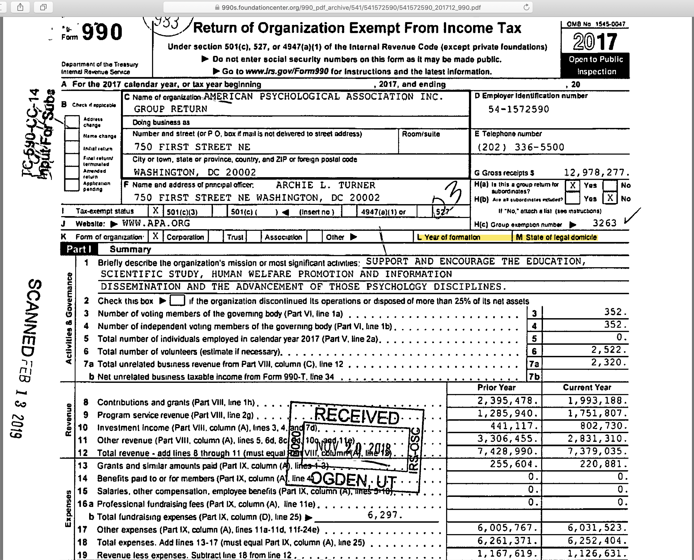 EIN#541572590 for “APA Group Return” (click “other options” to search again w/ EIN#~> HERE). Page 1 FY2017, others are from the Candid.org search results, sample listing of divisions’ EIN#s NOT included on this return, it seems. Img. 1 of 3