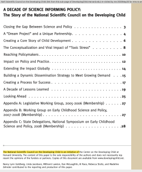For the past decade, a diverse group of distinguished scientists has worked to translate complex research about early brain development into language that is scientifically accurate, highly credible, understandable to nonscientists, and useful to public decision makers. Across the United States and around the world, in both public and private sectors, the work of the National Scientific Council on the Developing Child has helped change the conversation about providing young children with a healthy, safe, and nurturing start in life.”