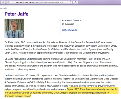 Peter Jaffe of CREVAWC, (<~faculty page there with brief bio and nice headshot) ((Canada, but with NCJFCJ involvement, and founder (it says right there) of the London Family Court Clinic) which I also posted on, is hardly going to “out” AFCC as a historically noncompliant PRIVATE tax-exempt organization in the USA, actively seeking to (and succeeding in) establishing its own brand of specialized courts to benefit its own members (this blog documents extensively, naming programs and personnel), because he IS AFCC.