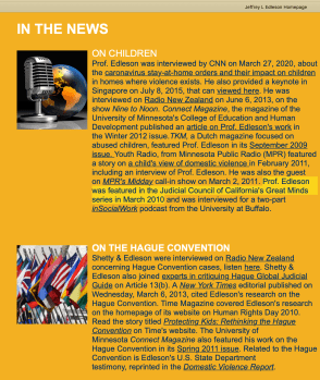 Prof. Edleson was interviewed by CNN on March 27, 2020, about the caronavirus stay-at-home orders and their impact on children in homes where violence exists. He also provided a keynote in Singapore on July 8, 2015, that can viewed here. He was interviewed on Radio New Zealand on June 6, 2013, on the show Nine to Noon. Connect Magazine, the magazine of the University of Minnesota’s College of Education and Human Development published an article on Prof. Edleson’s work in the Winter 2012 issue. TKM, a Dutch magazine focused on abused children, featured Prof. Edleson in its September 2009 issue. Youth Radio, from Minnesota Public Radio (MPR) featured a story on a child’s view of domestic violence in February 2011, including an interview of Prof. Edleson. He was also the guest on MPR’s Midday call-in show on March 2, 2011. Prof. Edleson was featured in the Judicial Council of California’s Great Minds series in March 2010 and was interviewed for a two-part inSocialWork podcast from the University at Buffalo.