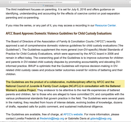In AFCC’s “Domestic Violence and the Family Court Project” page’s own words (and featuring a publication by Jaffe, Bala et. al), and this is referencing an event in 2008 (“Wingspread”) and the AFCC’s 45th Annual Conference (in Vancouver):