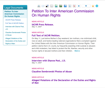 In this post, and by looking at prior posts which mentioned it, I again ran across Bancroft’s public lectures (for not being “peaceful” enough) against a known battered mother he felt was attacking a different formerly battered mother who happened to be helping promote (sell) his books on the “protective mothers” circuit, while this “circuit” fails to reveal that Bancroft was also working the “fatherhood” circuit. This topic reminded me of how the mother he was upset about, who I’d met and at the time knew (we were parallel blogging with some others) had a petition to an international commission on human rights violations by the United States, specific to this topic (i.e., in the family courts). I spoke out at the time, and I’m reviewing just how many DV organizations signed onto the petition that preceded it, Jessica Lenahan (Gonzales), by just a few months. Such women have often gone through hell, long-term.
