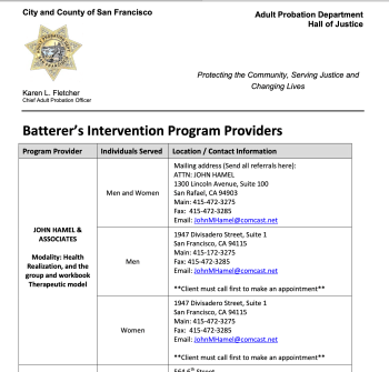 CityandCountyof ‘SF Batterer’s (sic) Intervention Program Providers’ (Adult Probatn Dept) (undated, shows John Hamel + Associates at the top) viewed 2020June24 Wed PST… Notice: Men & Women, i.e., joint counseling.