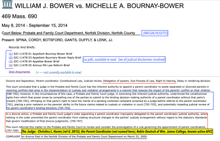 Due Process and improper delegation of authority problems in Bower v. Bournay-Bower divorce, parent-coordinator violations noted by higher court (Norfolk County, MA, Hon Christina Harms (Probate judge who appointed the PC) the PC in question (other filings show) was AFCC’s Robin Deutsch,historically directing a Center at Wm. James College (formerly, in fact about 2012, name-changed from Mass. School of Professional Psychology)