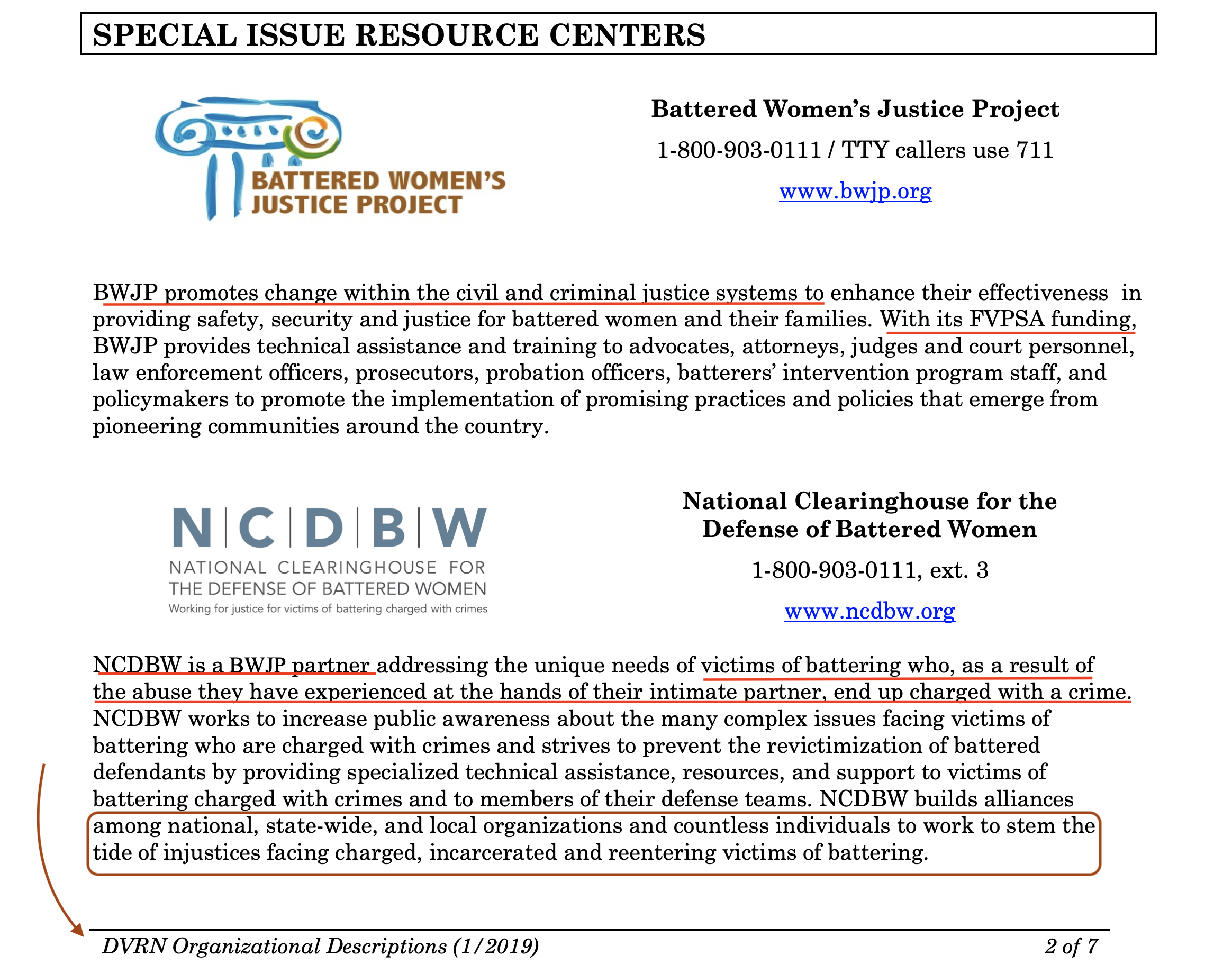 DVRN described at HHS.FYSB as of Jan. 2019 (link from Apr. 2017 HHS page) (checked Jun. 21, 2020), Just a sample; both closely linked to DAIP (Duluth Model, Ellen Pence [d.2012] org) & BWJP has collaborated with AFCC. (NDBW is quite small, BWJP, not large either).
