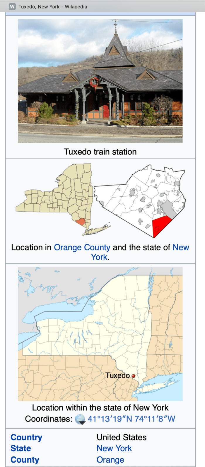 Wiki, Tuxedo, NY, location in Orange County, southern border near NJ and also (by definition) near NYC. Notice the quaint train station at top…