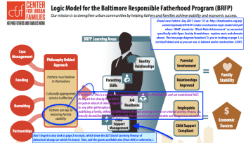 “The hypothesis driving CFUF’s programmatic approach is rooted in Social Learning Theory… associated with affecting (I think “effecting” was meant) positive behavioral change…. Elements of the BRFP (Baltimore Responsible Fatherhood Program) curriculum encourage fathers to reflect on the benefits of behavioral change on their individual well-being and that of their families.”
