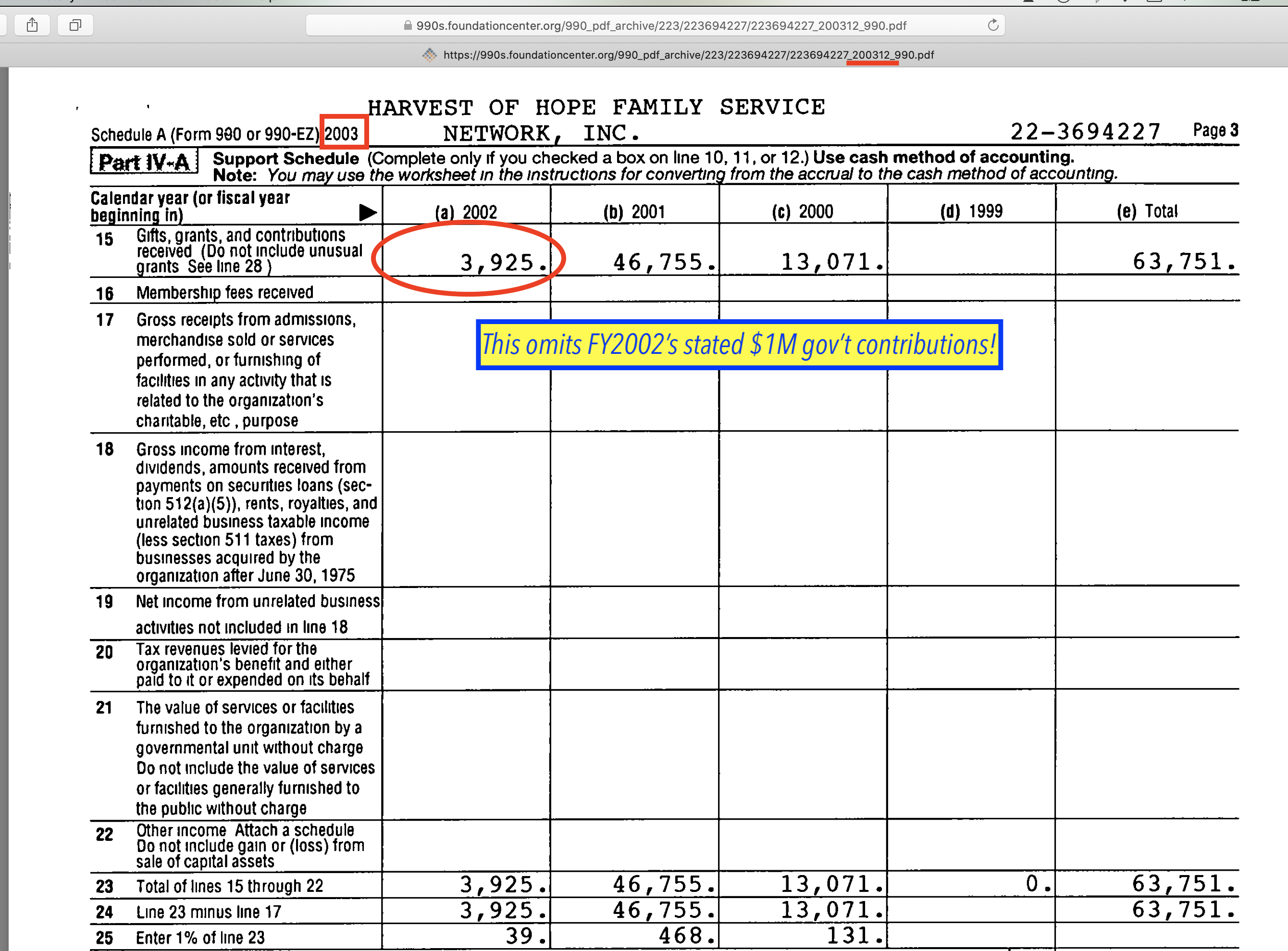 Far below, in the CBMA context, I show from the tax returns, and in a few larger, annotated images, how from near the start (as far back in time as I could access), in summarizing past years of support on its Schedules A, those Forms 990 for the “family services” entity omit, for more than one year, million-dollar government grants, instead reporting the only other contributions it received, in 2002, only about $4,000.