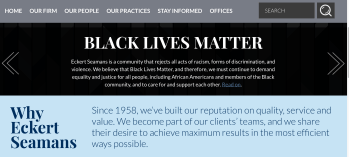 ** Eckert, Seamans et. al. show offices in: Boston, Buffalo, Charlston (W. Virginia), Harrisburg, Hartford (Connecticut), Newark, Philadelphia, Pittsburgh, Princeton, Providence (Rhode Island), Richmond (Virginia), Troy (Michigan), Washington, D.C., White Plains (NY), and Wilmington (Delaware) — how do you avoid hiring individuals who represent “Black Lives” as officer (or firm) leaders in ALL those cities? Note: Not a comment on their practices, just how odd it seems to be saying Black Lives Matter, but not demonstrating it on the public face of such a law firm (I also see “family law” not mentioned, at least on first level, on any of the links. Bloomberg.com describes law firm focus as “Consumer Discretionary”).