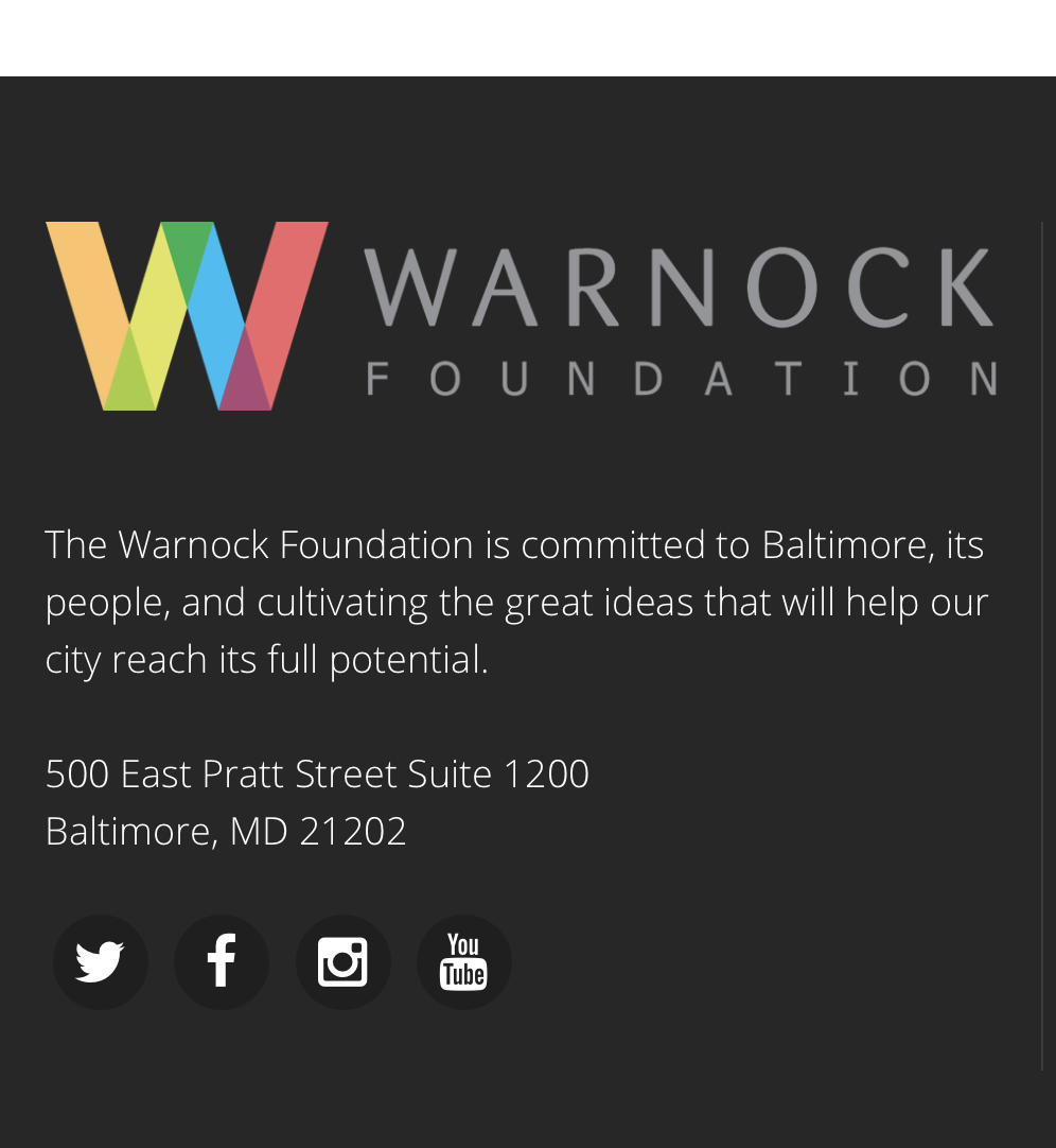 Warnock Foundation (David L Warnock), Contact is 500 East Pratt Street #1200, Baltimore, MD 21202 ~~Viewed 2020July03