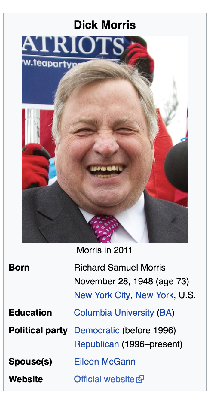 Wiki: Dick Morris in 2011 (thumbnail) context, “Triangulation” for my Feb 19,2022 (about) High-Conflict post.