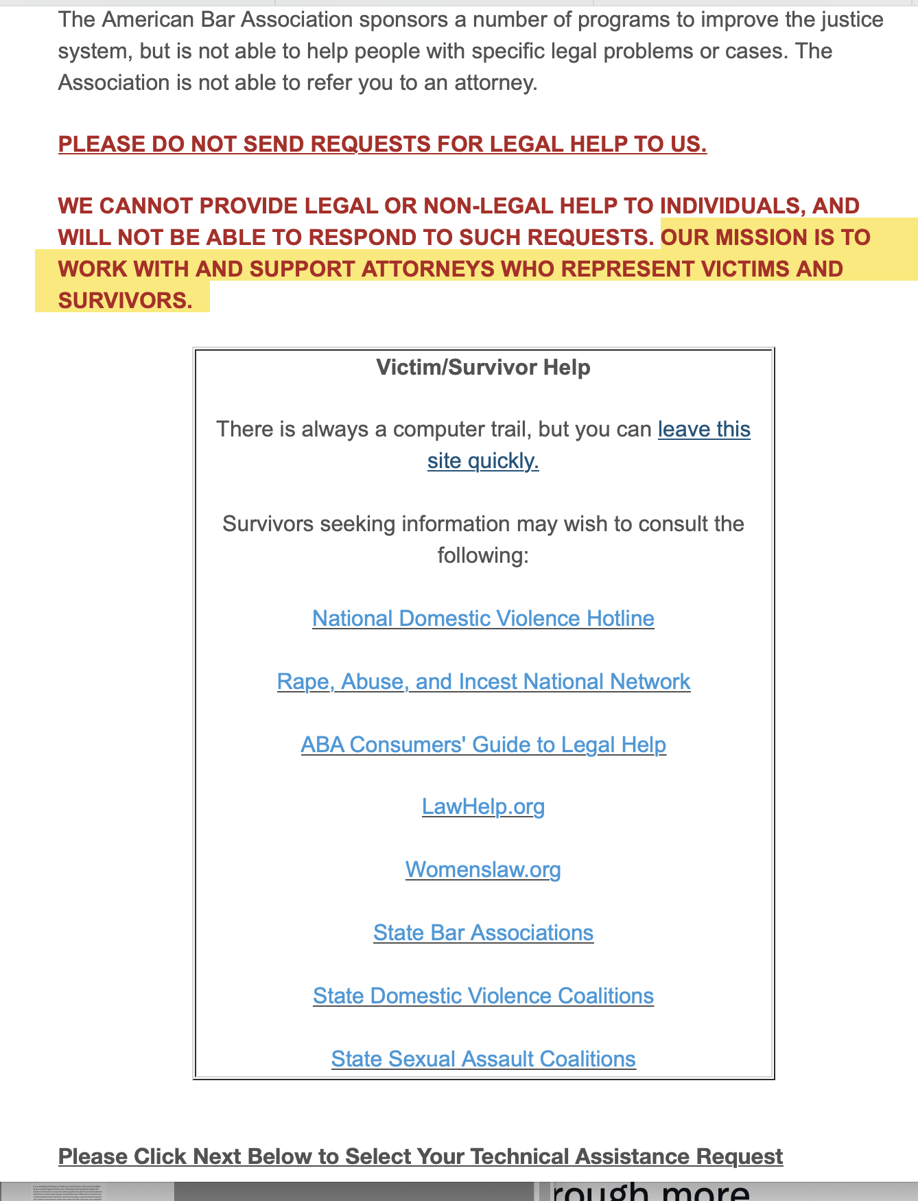 ABA Commission on Domestic & Sexual Violence (url implies that the “& Sexual was an afterthought) disclaimer lists individuals needing help (not T&TA) might call. These look like links but don’t seem to be interactive, @ 8March2022