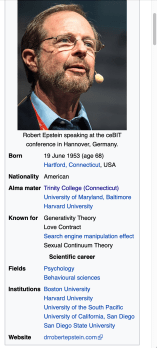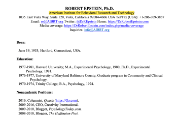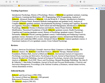 For example, at the Cambridge Center for Behavioral Studies, (Behavior.org) 1981 Founder Robert (NOT “Jeffrey!”) Epstein (Wikipedia) THIS Epstein is about my age (“I’ll never tell!”) and still going strong (his website, DrRobertEpstein.com), is a fan of (and helped “resurrect” from retirement) B.F. Skinner and is evangelistic and expert at self-promotion and continuing marketing, as his 52-page resume attests. The field, in case you haven’t guessed yet, is (start to finish) “Psychology.”