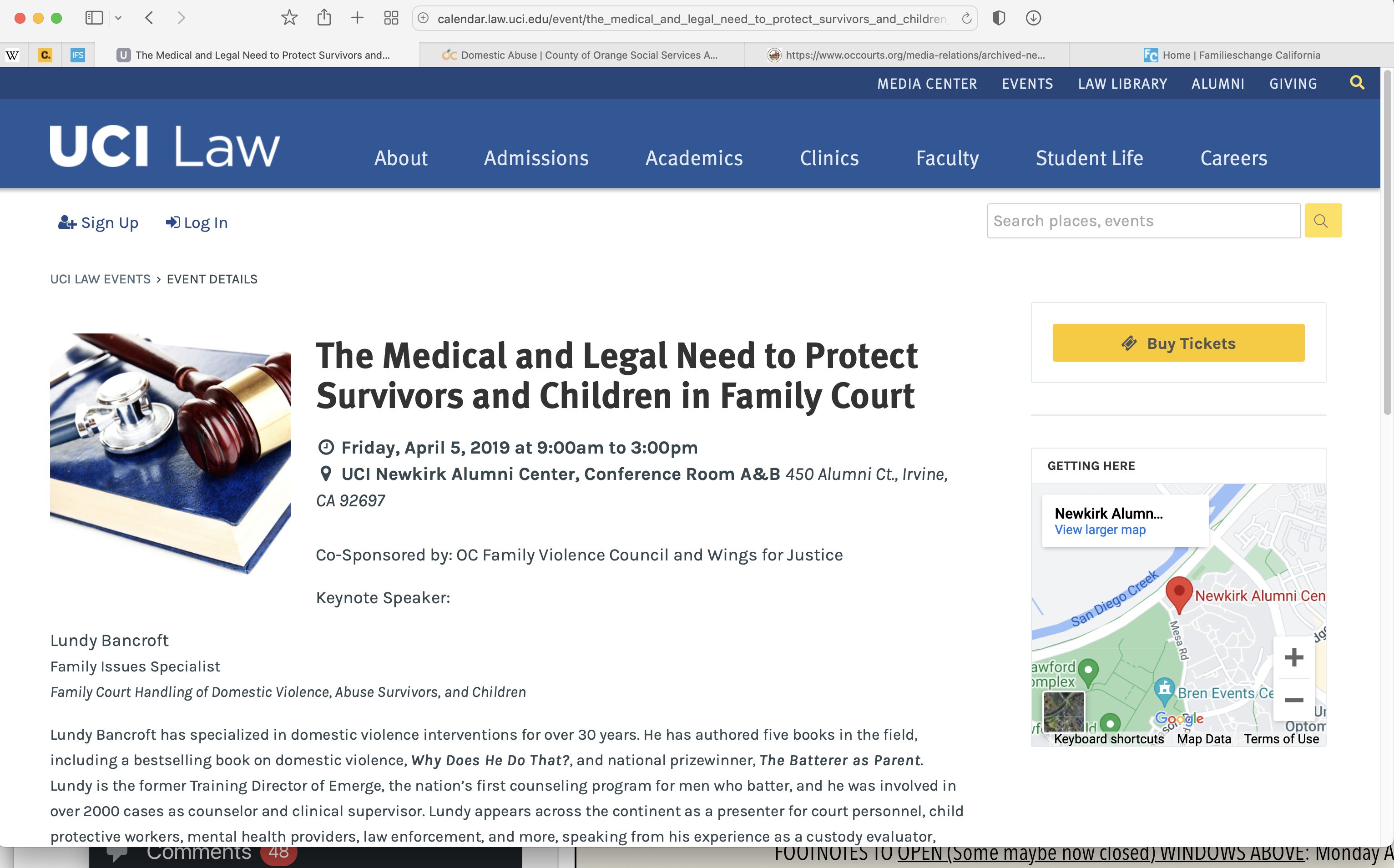 The Medical and Legal Need to Protect Survivors and Children in Family Courts (UCI Law, 5 April 2019 event) with WingsForJustice, Orange County Family Violence Council (co-sponsors), Keynote Speaker Lundy Bancroft (ending with reading of a play “Forbidden to Protect” by Bancroft & Patrice Lenowitz. Speaker Wendi Miller was murdered (not DV-related) the following Easter weekend, within a few weeks…