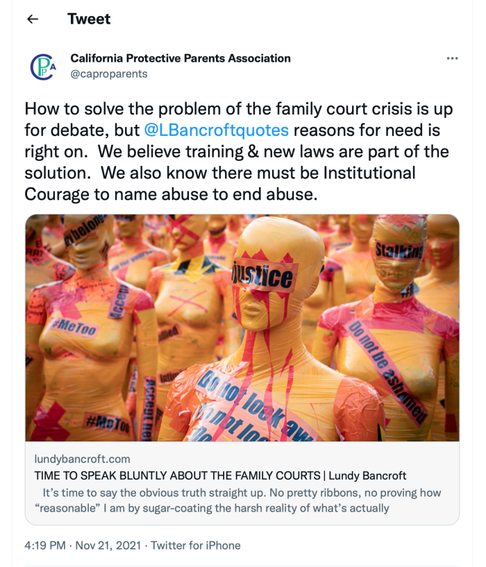 @CaProParents (CPPA) promoting (for free?) LundyBancroft.com, colorfully. The site promoted goes on for a few paragraphs and ends with a plug for his recent novel. From Nov. 2021.