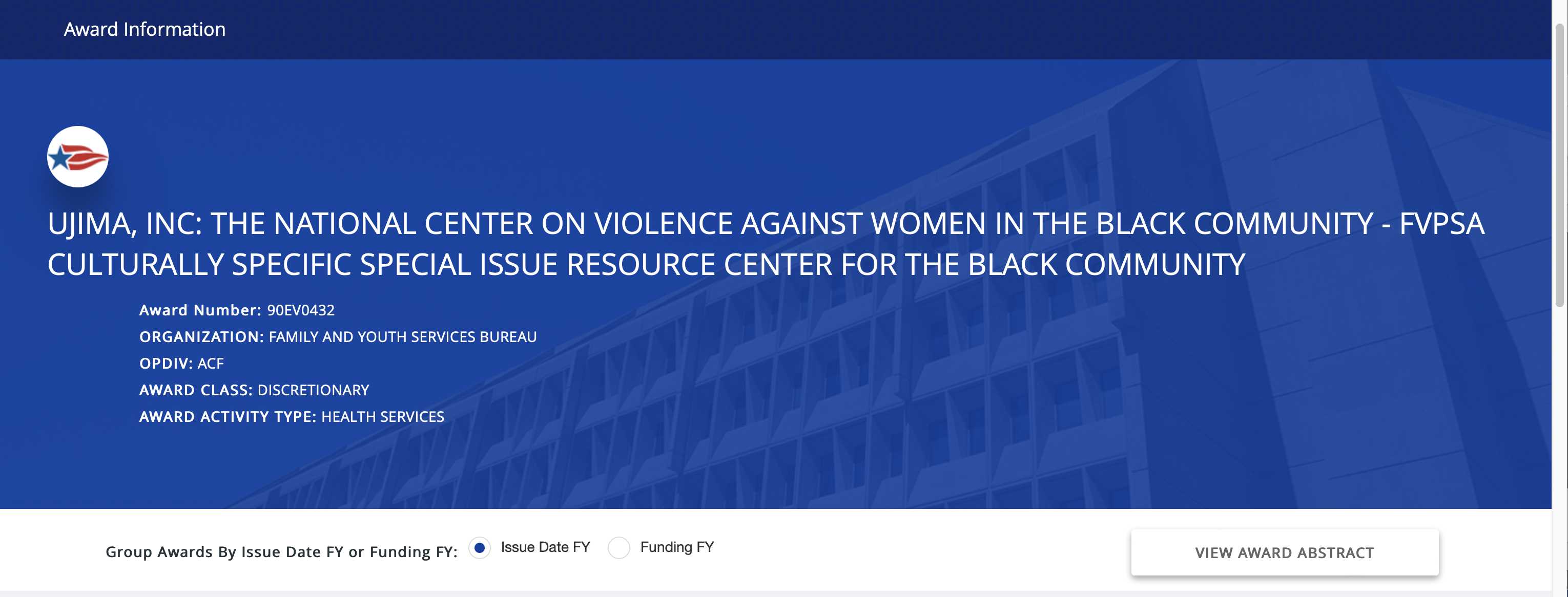 TAGGS.HHS.gov/SearchAdv results for Grant # EV90432 [to repeat: TAGGS-generated https://tinyurl.com/y6xrnf34, a grant# shown on UjimaCommunity.org resources (the Grantee is DCCADV and UJIMA was its project; grant began in 2016. UJIMA got IRS determination letter only in 2021