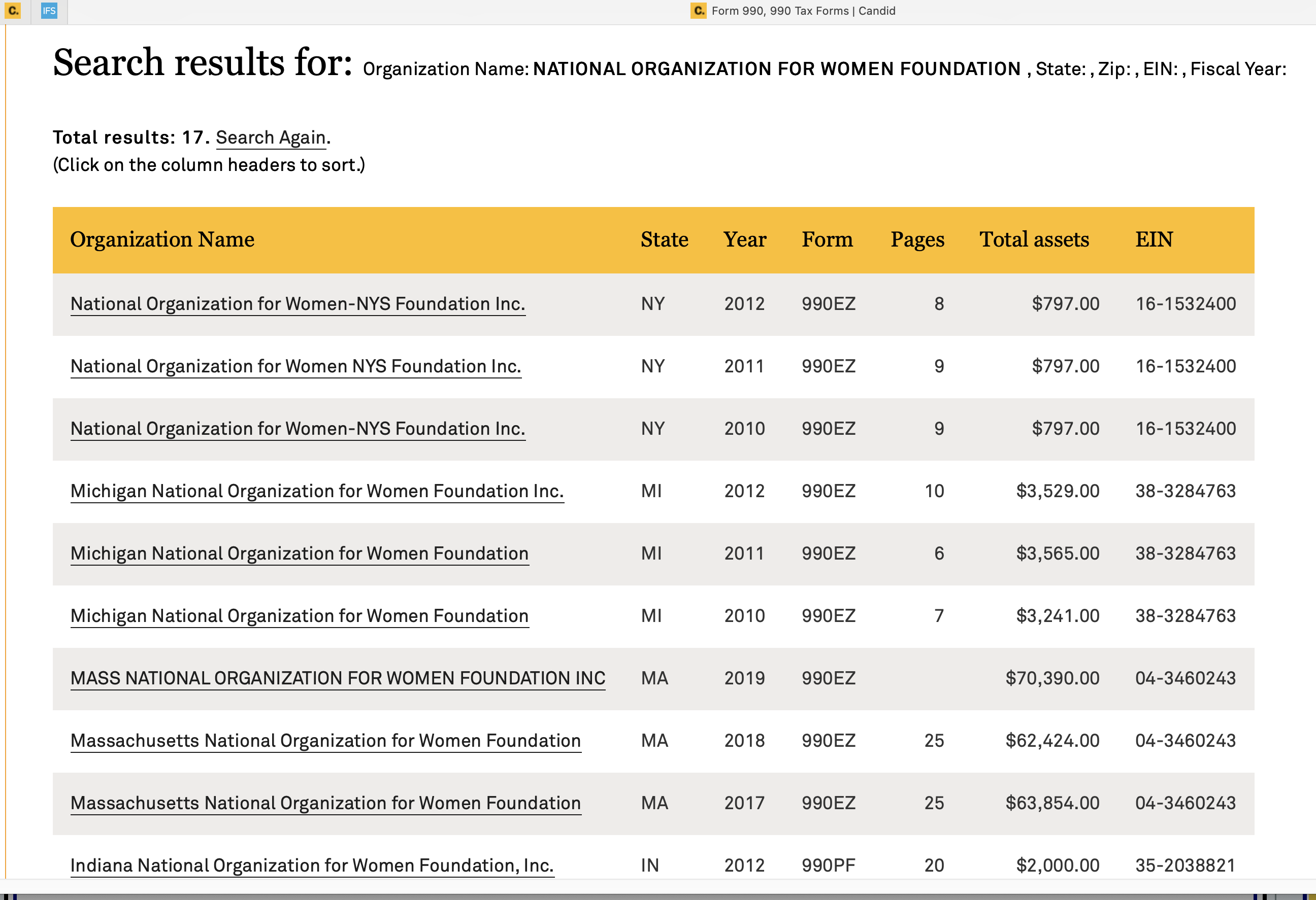 Candid.org name search for “National Organization for Women Foundation” (with correct spacing) brought up national and state results — but not (see next image) the two FYE2017 and 2018, where (Candid, not the attached Form 990 pdf, which we’re told is from the IRS) had a typing error — no space, and no initial cap for “foundation.” These are reverse alpha sort by state. Look at the years! (Image#1 of 2). For my 25 April 2022 blog, short-link ends “-egn”, TABLE TALK FOR TASK FORCES (COVID-19 DV RESPONSE, New Yor, State).