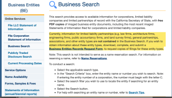 Most times, basically, a business search IS a business entity search. Within the United States, Search websites in state after state make this clear. The above example (image) is from California…. Search for (Google) “business entity search _______” and fill in the name of a state: or a country. A variety of websites will surface; some search sties are run by private businesses, others government. Check the URL formats). Either one could be charging fees to search, but most government sites don’t, at least for the very basic information.