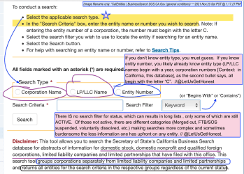 For California, (currently the search website is: BusinessSearch.sos.ca.gov), the word “entity” appears on both Business Search fields (and searchers, as in California, must choose which type of entity they are looking for) and in the search results, and on the Registry of Charitable Trusts ‘Verification Page.” One is run by the Secretary of State, (“SOS”) the other by the Office of Attorney General.